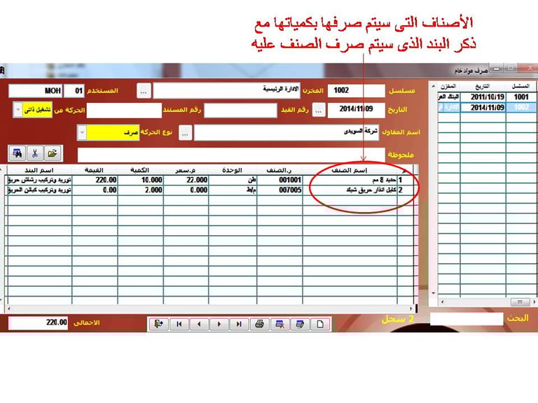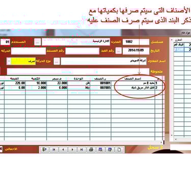 خلال ﺇذن الصرف المحدد به الكميات ورقم الاذن والموقع المنصرف له والمسئول عن الصرف وأمين المخزن والبند المنصرف عليه.