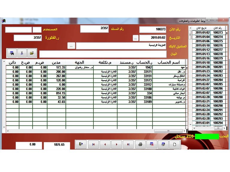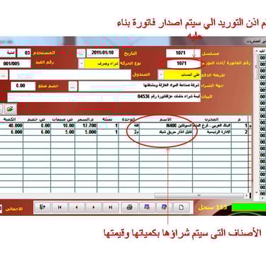 استلام فاتورة المشتريات وتسجيل بياناتها على البرنامج مثل أمر التوريد ولكنها تختلف فى التأثير على كشف حساب المورد والمخازن ويصدر عنها قيد محاسبى لاثبات قيمة المشتريات وايصال صرف النقدية / الشيكات للمورد.