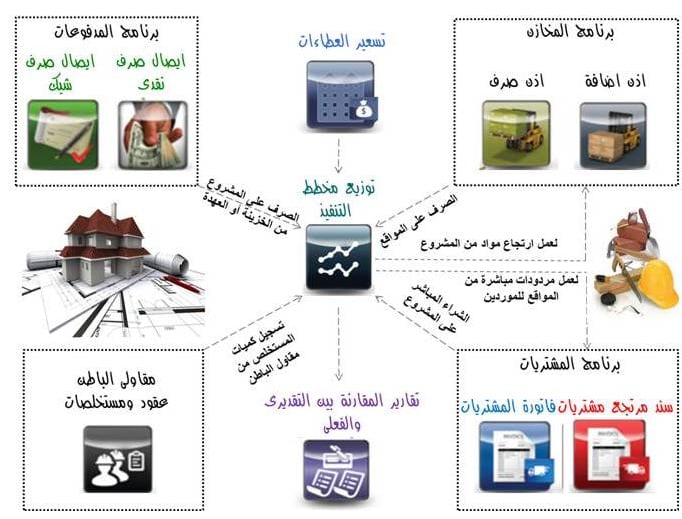 حيث يتم شراء الخامات وصرفها وصرف المصروفات والعهد والسلفيات والأجور والتأمينات على المشروع ومتابعة مراحل التنفيذ من خلال المستخلص التنفيذي (بمثابة مستخلص بغرض المراقبة داخل شركة المقاولات ولايقدم لأى جهة خارجية) ومؤشر دائم طوال فترة المشروع للمقارنة بين المنفذ والمخطط لكل بنود المشروع.